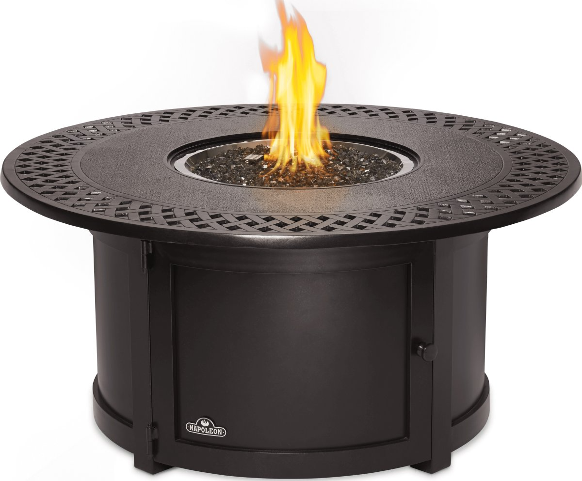 A rustic bronze finish with a woven pattern, lends a subtle luxury, which is further customizable with the addition of colored glass. The Napoleon Kensington Round Patioflame® Table includes a matching burner cover and an access door to hide the propane tank. Use the Napoleon Kensington Round Patioflame® Table to extend your entertaining well past dark.