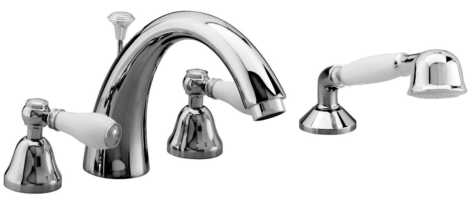 Complete deck-mount Roman bathtub faucet mixer 4 holes, complete with valve, diverter on the spout, handshower and flexible Gliss shower hose, 59’’ length, connection 1/2’’. max flow: 7.3 GPM.Read More